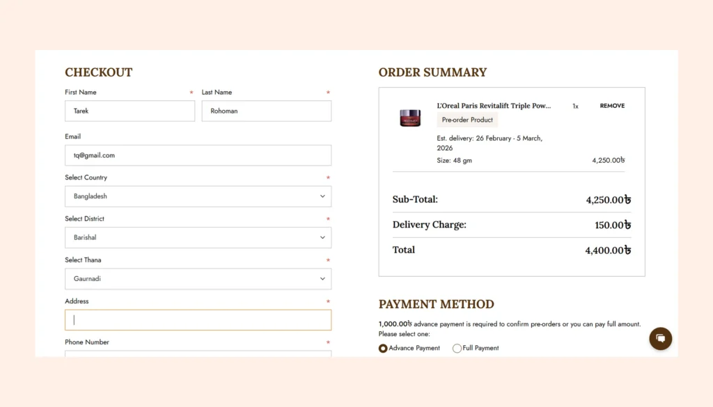 We implemented an advanced payment mechanism that supports location based and product type based rules. Customers outside Dhaka, and customers purchasing pre order products, can be required to pay an advance amount during checkout. This reduces fulfillment risk and improves order reliability, especially for courier deliveries and long lead time items.