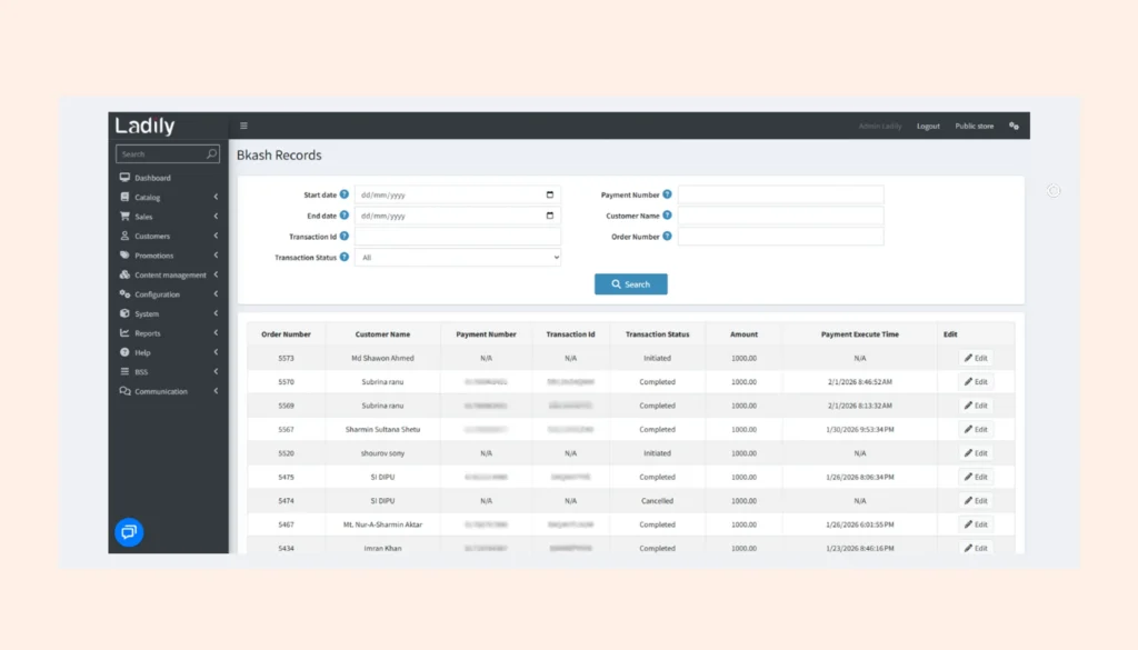 We integrated the bKash payment gateway to provide secure and familiar payments. Payment records are tracked inside the bKash plugin within the platform, supporting reconciliation and transparency, particularly for advance payment scenarios.